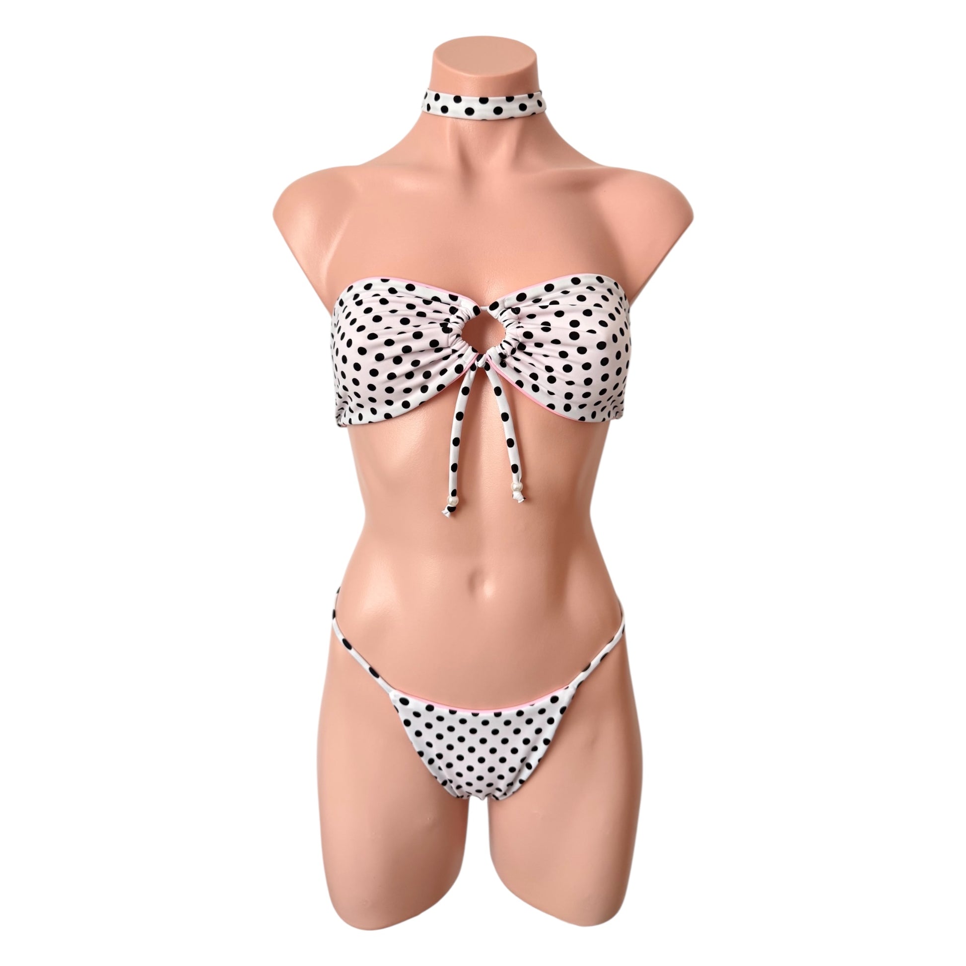 Embrace playful elegance with this three-piece swimsuit featuring a classic polkadot print. The strapless top offers a flattering fit and freedom of movement, while the cheeky bikini bottom provides a stylish edge. Completed with a coordinating neck accessory, this set combines fashion-forward design with confident, sexy appeal—perfect for making a statement at the beach or pool.